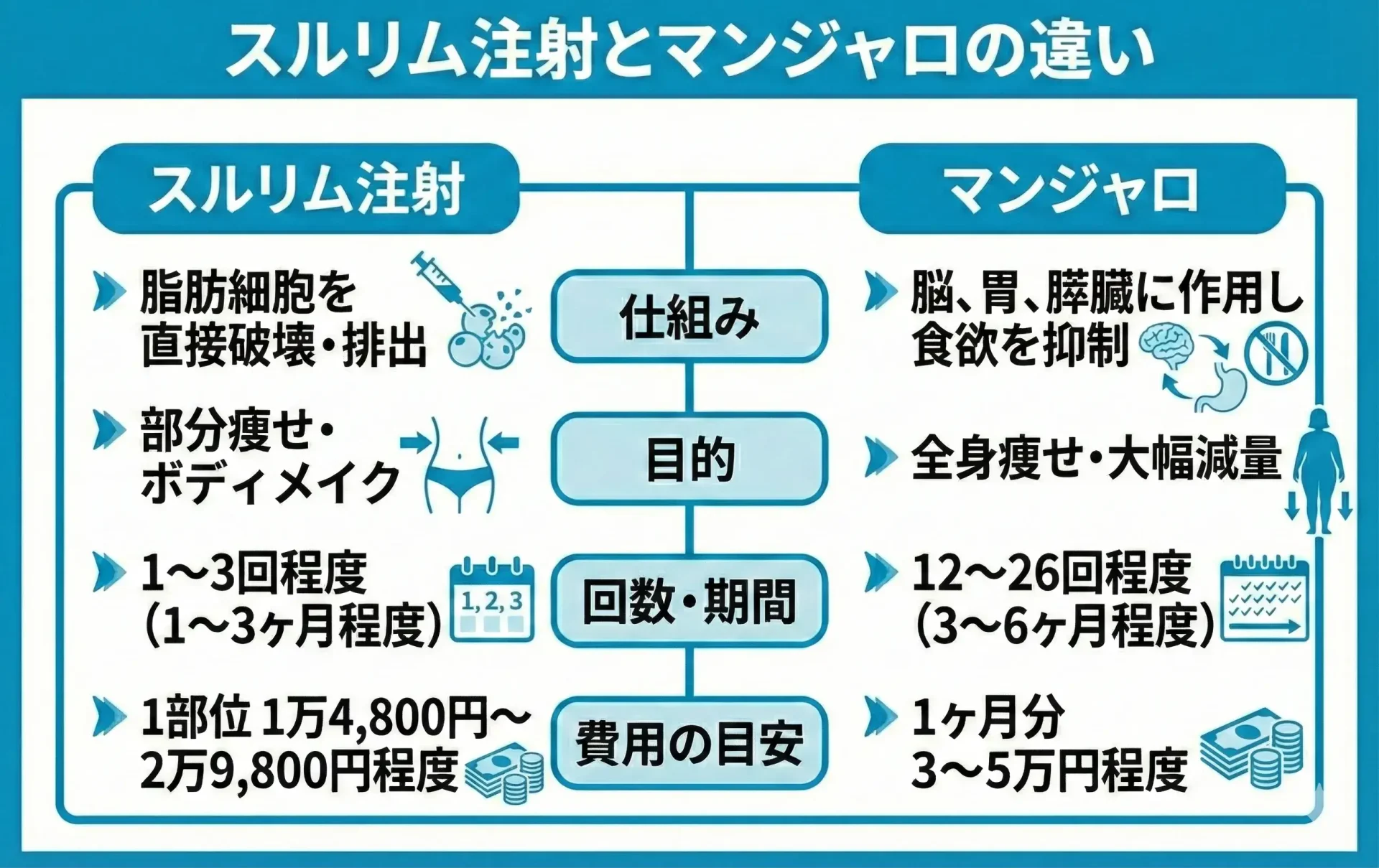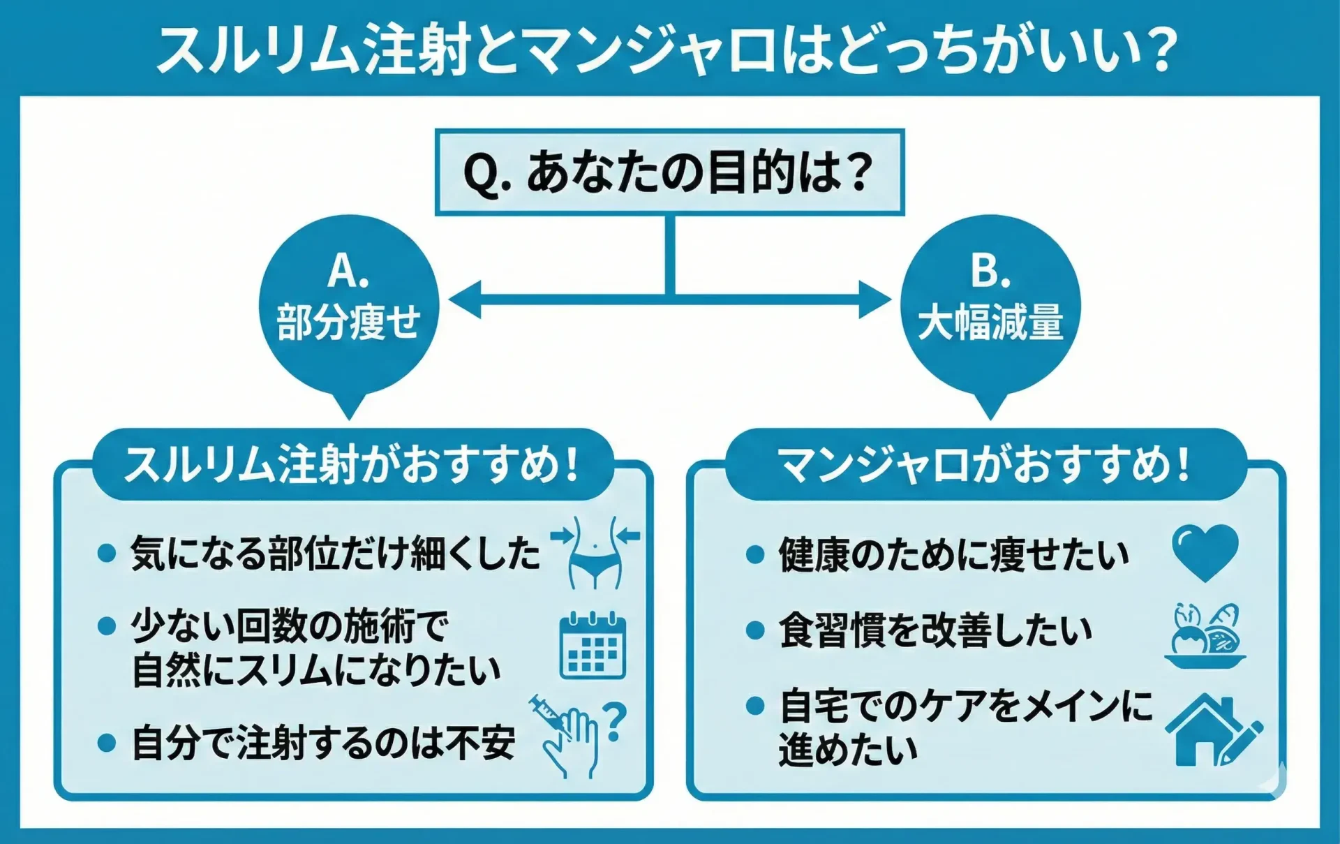「気になる部位をピンポイントで引き締めたいならスルリム注射」、「全身を大幅にサイズダウンさせたいならマンジャロ」を選ぶのが最も効率的な選び方です。