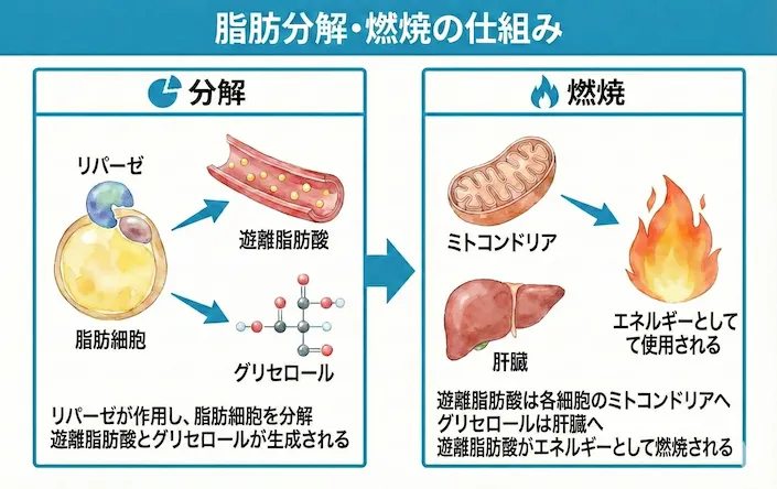 大きくなった脂肪細胞を小さくするには、まず中に詰まっている中性脂肪を「遊離脂肪酸」と「グリセロール」に変えて、細胞の外に追い出す必要があります。これを「分解」と呼びます。